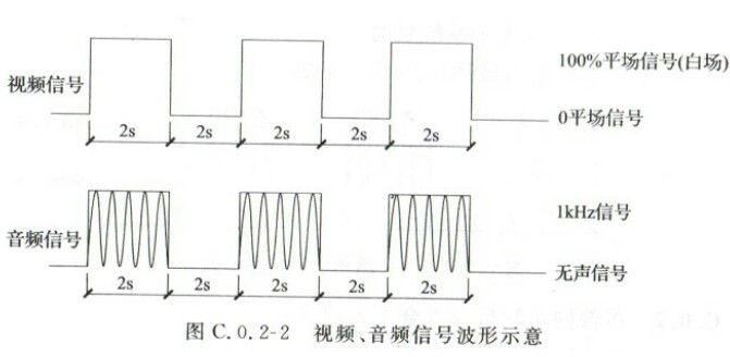 3)視頻信號與音頻信號之間存在特定關(guān)系,見圖C.0.2-2,其中視頻l00%平場信號與音頻lkHz正弦波信號同步,視頻0平場信號與音頻無聲信號同步。