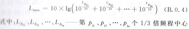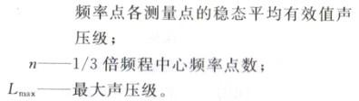 4)按本規(guī)范式(B.0.2)計算得各1/3倍頻程頻率點(diǎn)各測量點(diǎn)的平均有效值聲壓級;然后按下式計算得到額定傳輸頻率范圍內(nèi)最大有效值總聲壓級,即為最大聲壓級。