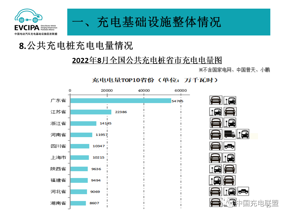 公共充電基礎(chǔ)設(shè)施省、區(qū)、市運(yùn)行情況,廣東、江蘇、上海、浙江、北京、湖北、山東、安徽、河南、福建TOP10地區(qū)建設(shè)的公共充電樁占比達(dá)71.4%。全國(guó)充電電量主要集中在廣東、江蘇、浙江、河南、四川、上海、陜西、福建、河北、湖南等省份,電量流向以公交車(chē)和乘用車(chē)為主,環(huán)衛(wèi)物流車(chē)、出租車(chē)等其他類(lèi)型車(chē)輛占比較小。2022年8月全國(guó)充電總電量約23.3億度,較上月增加1.4億度,同比增長(zhǎng)135.6%,環(huán)比增加6.3%。大牛工程師