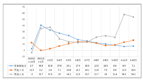 圖3  大連市規(guī)上裝備制造業(yè)、石化工業(yè)、醫(yī)藥工業(yè)增加值增速(%)(遼寧?。┐筮B市2021年規(guī)上工業(yè)運行簡析