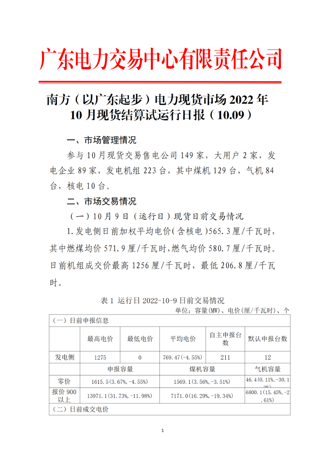 2022年|2022年10月9日南方(以廣東起步)電力現(xiàn)貨市場結(jié)算試運行日報