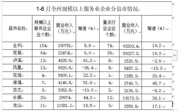 全州八個(gè)縣市,共有134家規(guī)模以上服務(wù)業(yè)企業(yè)。分縣市看,各縣市發(fā)展差異較大,一方面規(guī)模以上服務(wù)業(yè)企業(yè)的個(gè)數(shù)相差很大,1-6月全州規(guī)模以上服務(wù)業(yè)企業(yè)有134家,其中吉首64家,古丈3家,相差61家,在全州74家重點(diǎn)行業(yè)企業(yè)中,吉首36家,花垣僅1家;另一方面各縣市規(guī)模以上服務(wù)業(yè)企業(yè)發(fā)展速度不一,1-6月瀘溪縣規(guī)模以上服務(wù)業(yè)企業(yè)營(yíng)業(yè)收入同比增長(zhǎng)61.2%,鳳凰縣規(guī)模以上服務(wù)業(yè)企業(yè)營(yíng)業(yè)收入同比下降36.4%,相差97.7個(gè)百分點(diǎn)。