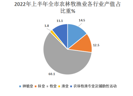 4.從農(nóng)林牧漁各行業(yè)占比重看,畜牧業(yè)占比重最高。2022年上半年,我市種植業(yè)、林業(yè)、畜牧業(yè)、漁業(yè)、農(nóng)林牧漁專業(yè)及輔助性活動產(chǎn)值占農(nóng)林牧漁業(yè)總產(chǎn)值的比重分別為14.5%、12.5%、60.1%、1.8%和11.1%,畜牧業(yè)占比重最高。