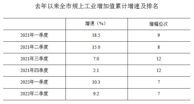 2022年1-6月,我市規(guī)上工業(yè)增加值同比增長(zhǎng)9.2%,較一季度下降1.1個(gè)百分點(diǎn),高于全省平均5.7個(gè)百分點(diǎn),居第七位。