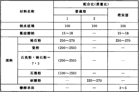 3 耐酸砂漿配合比:鈉水玻璃:砂漿混合料=100:340~420耐酸混凝土配合比:鈉水玻璃:混凝土混合料=100:490~750。