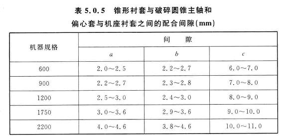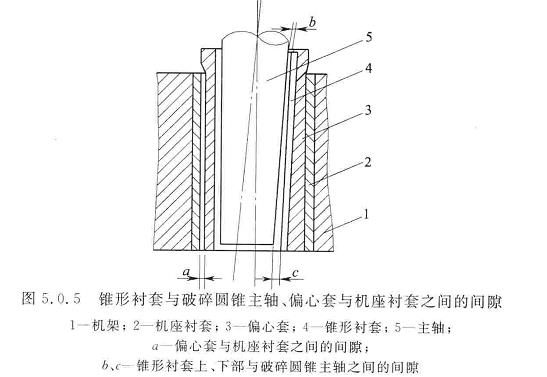 5.0.5錐形襯套與破碎圓錐主軸和偏心套與機(jī)座襯套之間的配合間隙(圖5.0.5).應(yīng)符合表5.0.5的規(guī)定;尼龍?zhí)椎呐浜祥g隙,應(yīng)符合隨機(jī)技術(shù)文件的規(guī)定。