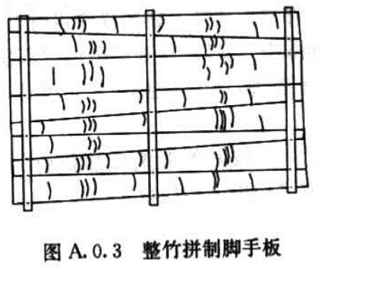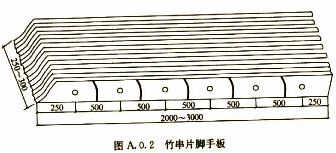 A.0.2 竹串片腳手板應采用螺栓穿過并列的竹片擰緊而成,螺栓直徑應為8mm~10mm,間距應為500mm~600mm,螺栓孔直徑不得大于10mm。板的厚度不得小于50mm,寬度應為250mm~300mm,長度應為2m~3.5m(圖A.0.2)。