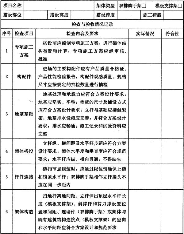 3 構(gòu)配件進(jìn)場、基礎(chǔ)施工、架體搭設(shè)、防護(hù)設(shè)施施工階段的施工記錄及質(zhì)量檢查記錄。