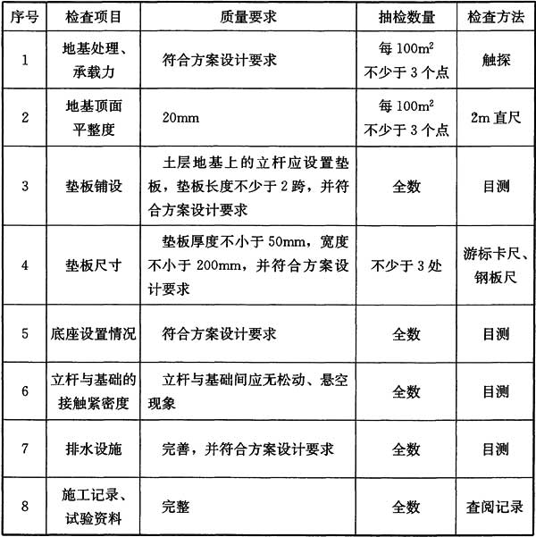 3 基礎(chǔ)不應(yīng)有不均勻沉降,立桿底座和墊板與基礎(chǔ)間應(yīng)無松動、懸空現(xiàn)象;