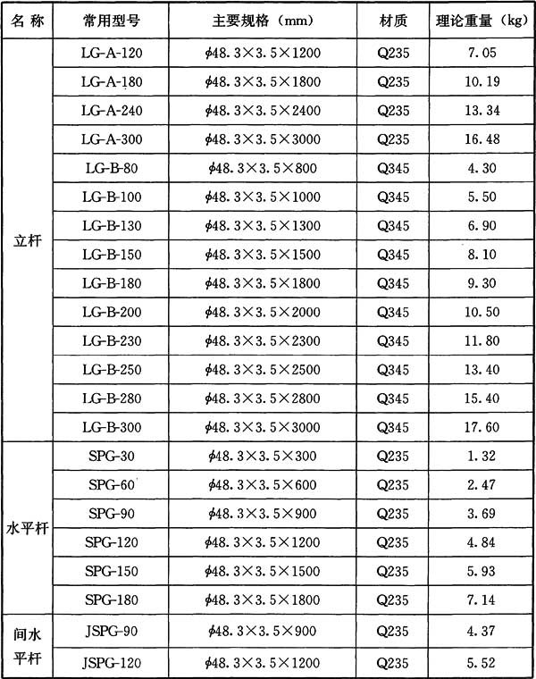 注:表中所列立桿型號標(biāo)識為“-A”代表節(jié)點(diǎn)間距按0.6m模數(shù)(Q235材質(zhì)立桿)設(shè)置;標(biāo)識為“-B”代表節(jié)點(diǎn)間距按0.5m模數(shù)(Q345材質(zhì)立桿)設(shè)置。