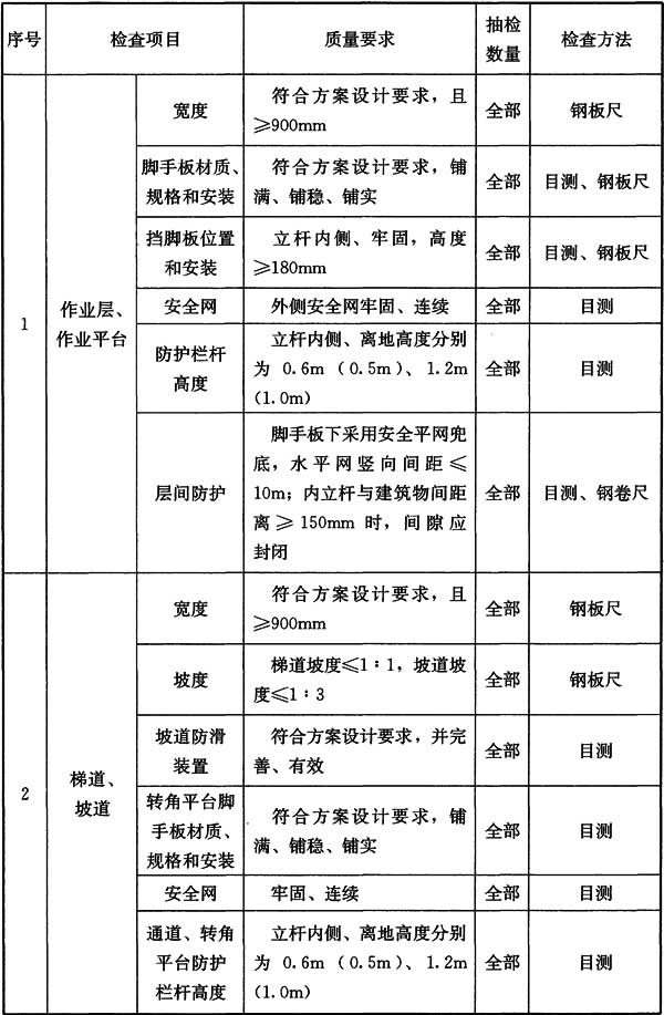 1 作業(yè)層寬度、腳手板、擋腳板、防護(hù)欄桿、安全網(wǎng)、水平防護(hù)的設(shè)置應(yīng)齊全、牢固;