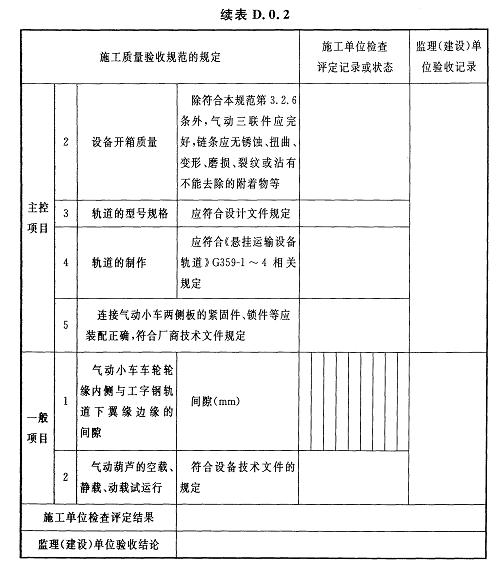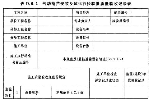 D.0.2氣動葫蘆安裝及試運行檢驗批質(zhì)量驗收記錄應(yīng)符合表D.0.2的規(guī)定。
