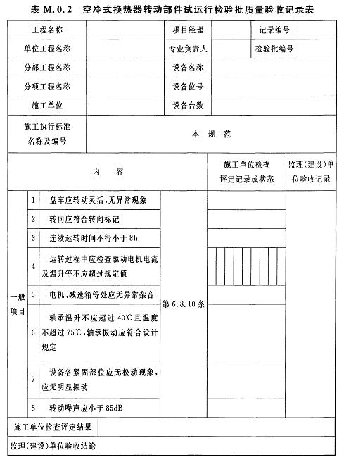 M.0.2空冷式換熱器轉(zhuǎn)動部件試運行檢驗批質(zhì)量驗收記錄應(yīng)符合表M.0.2的規(guī)定。
