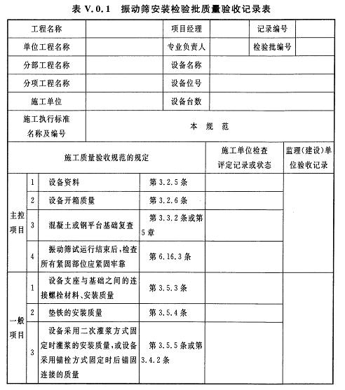 V.0.1振動篩安裝檢驗批質(zhì)量驗收記錄應(yīng)符合表V.0.1的規(guī)定。