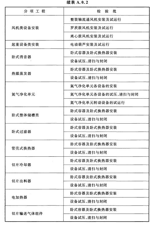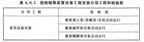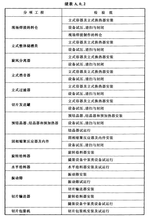 A.0.2固相縮聚裝置設(shè)備工程安裝分項工程和檢驗批應(yīng)符合表A.0.2的規(guī)定。