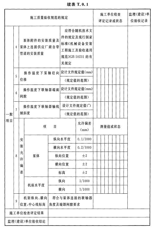 T.0.1預聚物輸送泵、熔體輸送泵安裝檢驗批質(zhì)量驗收記錄應(yīng)符合表T.0.1的規(guī)定。