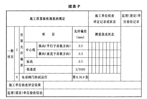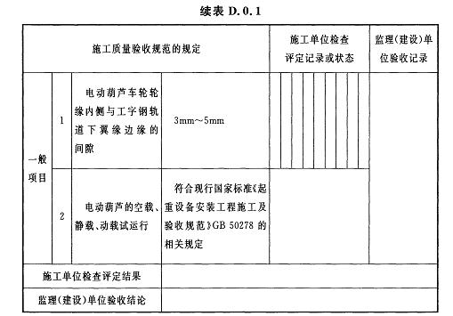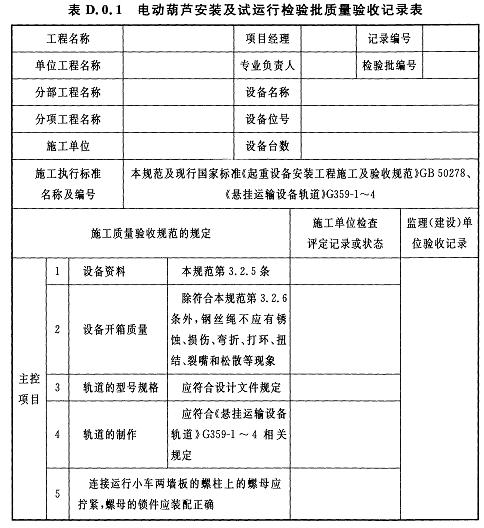 D.0.1電動葫蘆安裝及試運行檢驗批質(zhì)量驗收記錄應(yīng)符合表D.0.1的規(guī)定。