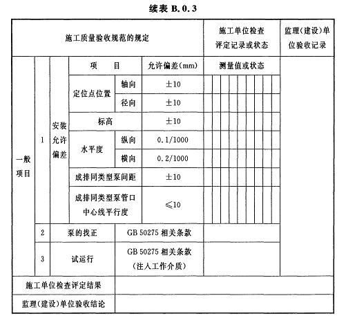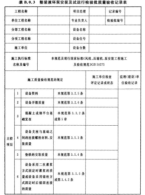 B.0.3整裝液環(huán)泵安裝及試運行檢驗批質(zhì)量驗收記錄應(yīng)符合表B.0.3的規(guī)定。