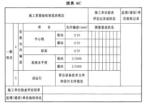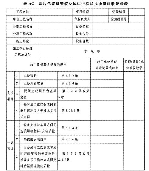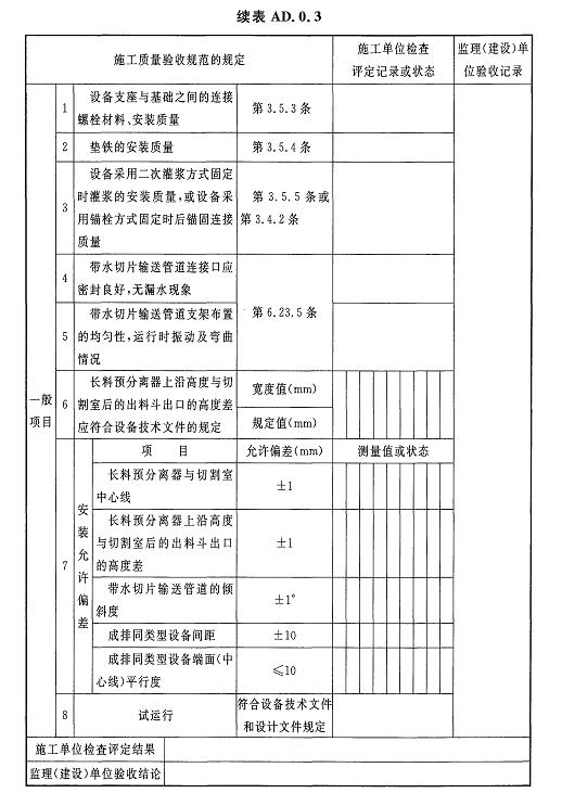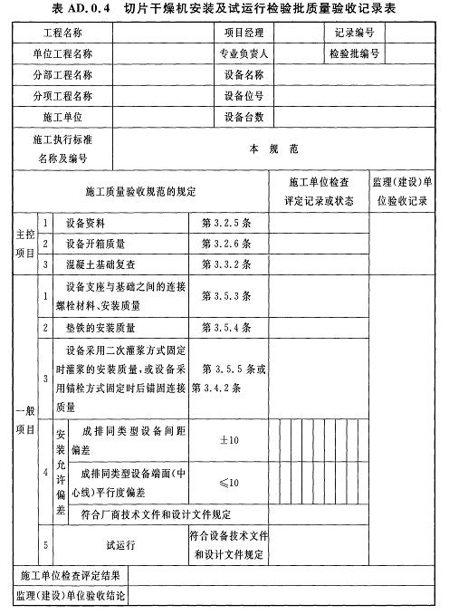 AD.0.4切片干燥機安裝及試運行檢驗批質(zhì)量驗收記錄應(yīng)符合表AD.0.4的規(guī)定。