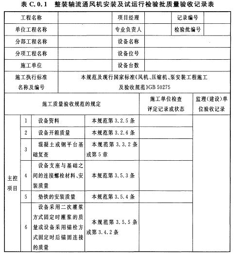 C.0.1整裝軸流通風機安裝及試運行檢驗批質(zhì)量驗收記錄應(yīng)符合表C.0.1的規(guī)定。