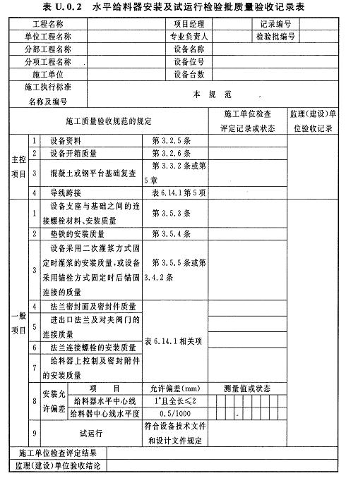 U.0.2水平給料器安裝及試運行檢驗批質(zhì)量驗收記錄應(yīng)符合表U.0.2的規(guī)定。