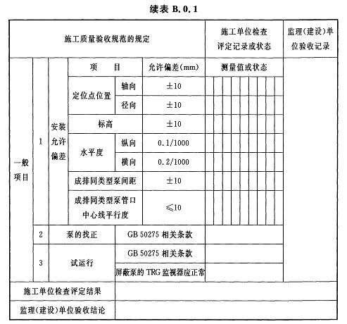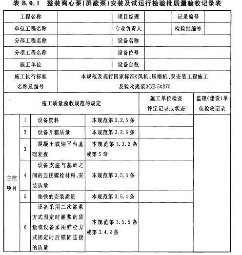 B.0.1整裝離心泵(屏蔽泵)安裝及試運行檢驗批質(zhì)量驗收記錄應(yīng)符合表B.0.1的規(guī)定。