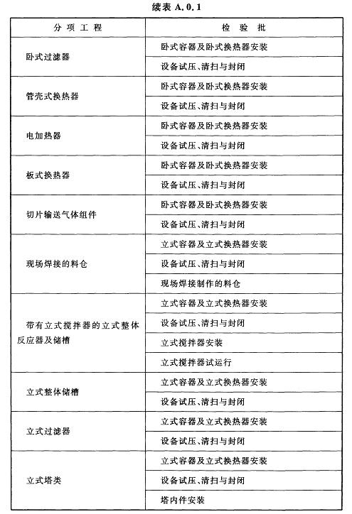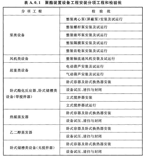 A.0.1聚酯裝置設(shè)備工程安裝分項工程和檢驗批應(yīng)符合表A.0.1的規(guī)定。