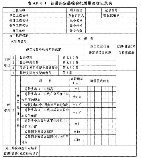 AD.0.1鑄帶頭安裝檢驗批質(zhì)量驗收記錄應(yīng)符合表AD.0.1的規(guī)定。