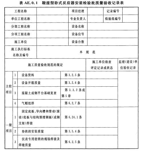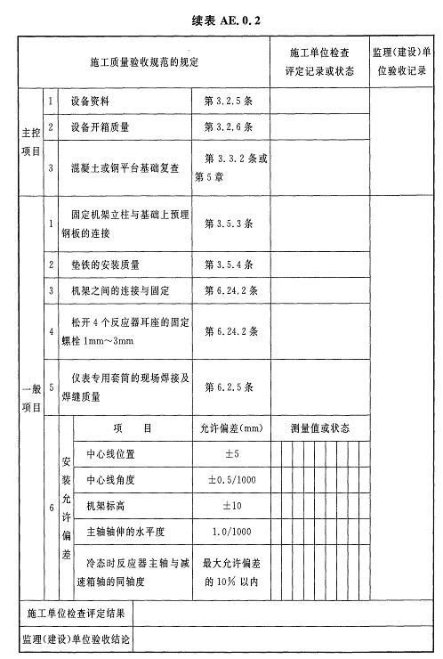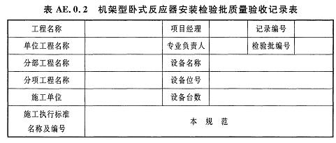 AE.0.2機架型臥式反應(yīng)器安裝檢驗批質(zhì)量驗收記錄應(yīng)符合表AE.0.2的規(guī)定。