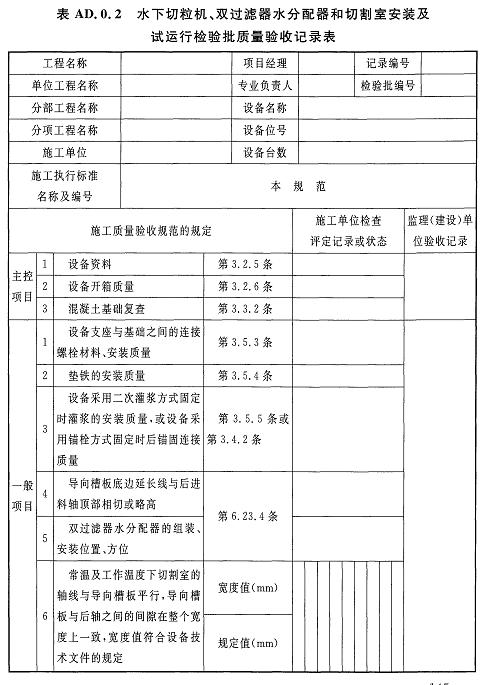 AD.0.2水下切粒機、雙過濾器水分配器和切割室安裝及試運行檢驗批質(zhì)量驗收記錄應(yīng)符合表AD.0.2的規(guī)定。