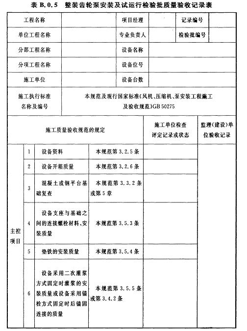 B.0.5整裝齒輪泵安裝及試運行檢驗批質(zhì)量驗收記錄應(yīng)符合表B.0.5的規(guī)定。