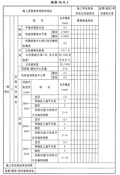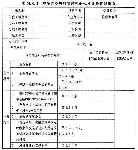 M.0.1空冷式換熱器安裝檢驗批質(zhì)量驗收記錄應(yīng)符合表M.0.1的規(guī)定。