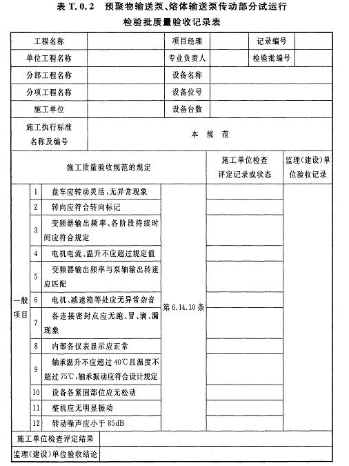 T.0.2預聚物輸送泵、熔體輸送泵傳動部分試運行檢驗批質(zhì)量驗收記錄應(yīng)符合表T.0.2的規(guī)定。