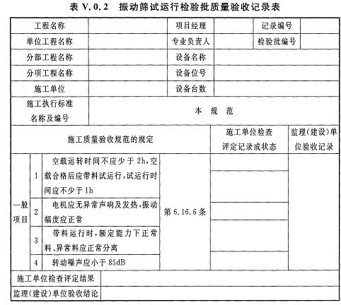 V.0.2振動篩試運行檢驗批質(zhì)量驗收記錄應(yīng)符合表V.0.2的規(guī)定。