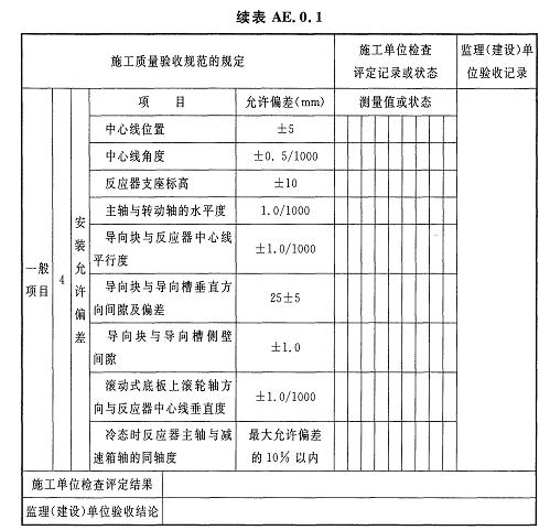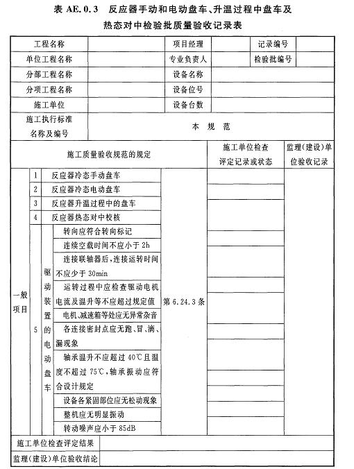 AE.0.3反應(yīng)器手動和電動盤車、升溫過程中盤車及熱態(tài)對中檢驗批質(zhì)量驗收記錄應(yīng)符合表AE.0.3的規(guī)定。