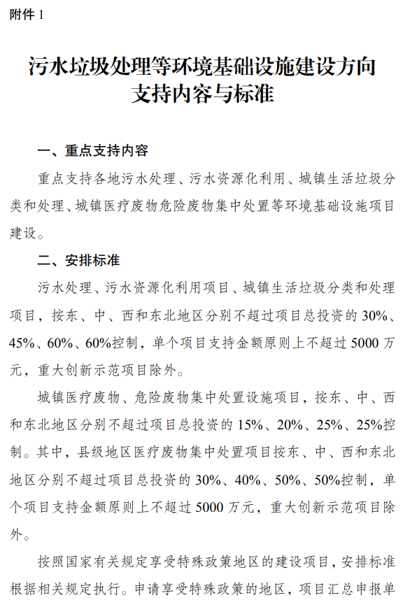 重點(diǎn)支持各地污水處理、污水資源化利用、城鎮(zhèn)生活垃圾分類(lèi)和處理、城鎮(zhèn)醫(yī)療廢物危險(xiǎn)廢物集中處置等環(huán)境基礎(chǔ)設(shè)施項(xiàng)目建設(shè)。
