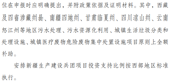 污水處理、污水資源化利用項(xiàng)目、城鎮(zhèn)生活垃圾分類(lèi)和處理項(xiàng)目,按東、中、西和東北地區(qū)分別不超過(guò)項(xiàng)目總投資的 30%、 45%、60%、60%控制,單個(gè)項(xiàng)目支持金額原則上不超過(guò) 5000萬(wàn)元,重大創(chuàng)新示范項(xiàng)目除外。?