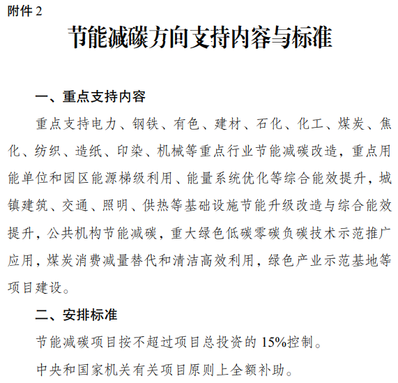 重點(diǎn)支持電力、鋼鐵、有色、建材、石化、化工、煤炭、焦 化、紡織、造紙、印染、機(jī)械等重點(diǎn)行業(yè)節(jié)能減碳改造,重點(diǎn)用能單位和園區(qū)能源梯級(jí)利用、能量系統(tǒng)優(yōu)化等綜合能效提升,城鎮(zhèn)建筑、交通、照明、供熱等基礎(chǔ)設(shè)施節(jié)能升級(jí)改造與綜合能效 提升,公共機(jī)構(gòu)節(jié)能減碳,重大綠色低碳零碳負(fù)碳技術(shù)示范推廣應(yīng)用,煤炭消費(fèi)減量替代和清潔高效利用,綠色產(chǎn)業(yè)示范基地等項(xiàng)目建設(shè)。