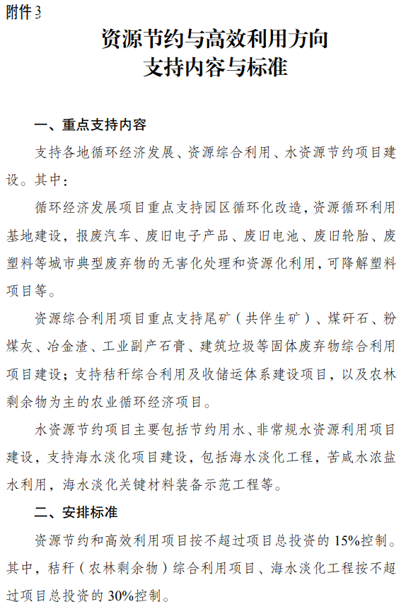 支持各地循環(huán)經(jīng)濟(jì)發(fā)展、資源綜合利用、水資源節(jié)約項(xiàng)目建設(shè)。資源節(jié)約和高效利用項(xiàng)目按不超過(guò)項(xiàng)目總投資的15%控制。 其中,秸稈(農(nóng)林剩余物)綜合利用項(xiàng)目、海水淡化工程按不超過(guò)項(xiàng)目總投資的 30%控制。