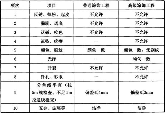 8.0.5 合成樹脂乳液內(nèi)墻涂飾材料的涂飾工程按質(zhì)量應(yīng)分為普通涂飾工程和高級涂飾工程,并應(yīng)符合表8.0.5規(guī)定。