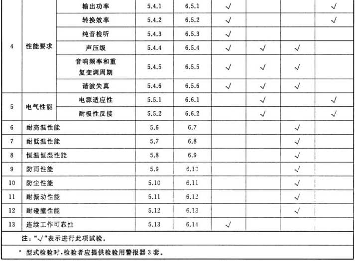 警報(bào)器應(yīng)能無故障地連續(xù)工作200h;且連續(xù)工作200h后,聲壓級(jí)變化量應(yīng)不超過±3dB,音響頻率變化量應(yīng)不超過±20Hz,重復(fù)變調(diào)周期變化應(yīng)在-10%~+10%之間。