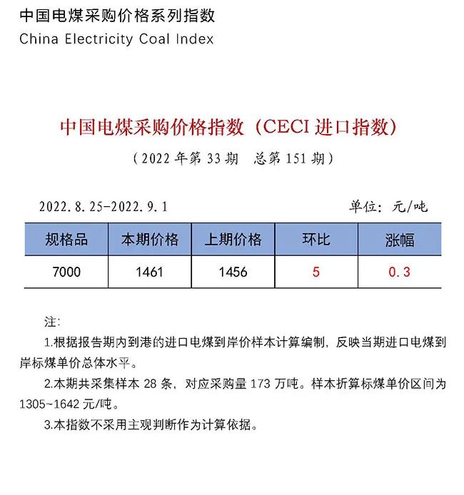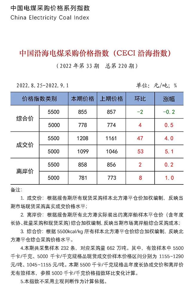 2022年|中國電煤采購價格CECI系列指數(shù)(2022年8月25日-9月1日)
