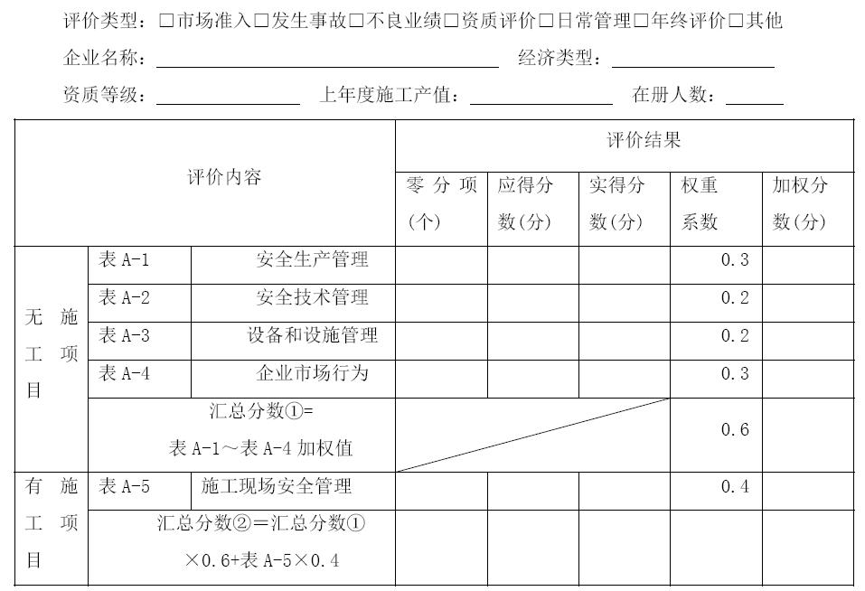 2 當(dāng)施工企業(yè)有施工現(xiàn)場時(shí),應(yīng)采用本標(biāo)準(zhǔn)附錄A中表A-1~表A-5進(jìn)行評(píng)價(jià);