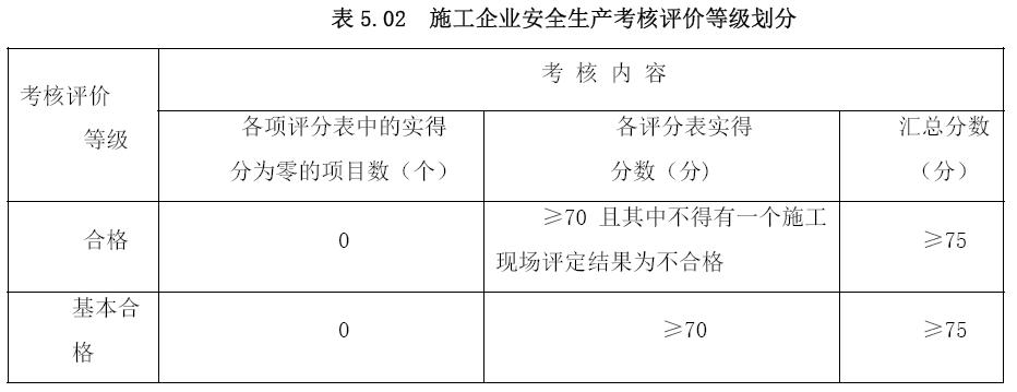 5.0.1 施工企業(yè)安全生產(chǎn)考核評(píng)定應(yīng)分為合格、基本合格、不合格三個(gè)等級(jí),并宜符合下列要求:
