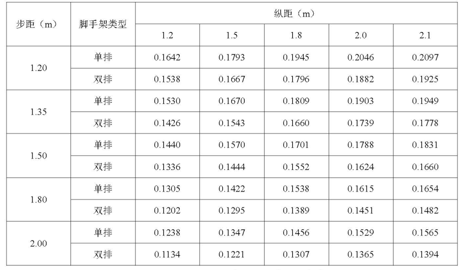 A.0.1 單、雙排腳手架立桿承受的每米結(jié)構(gòu)自重標(biāo)準(zhǔn)值,可按表A.0.1的規(guī)定取用。
