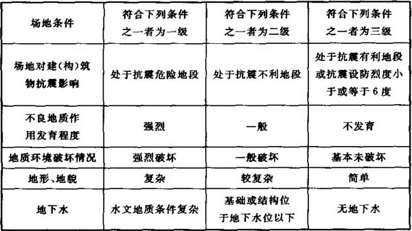 3.0.5 場地復(fù)雜程度可根據(jù)場地的地形、地質(zhì)及其他條件分為三級(jí),按表3.0.5進(jìn)行劃分。