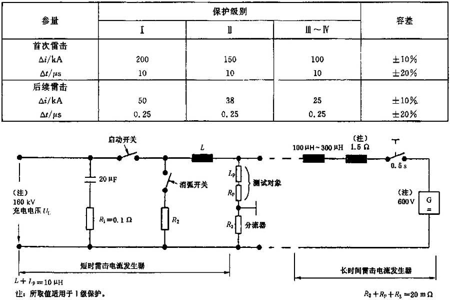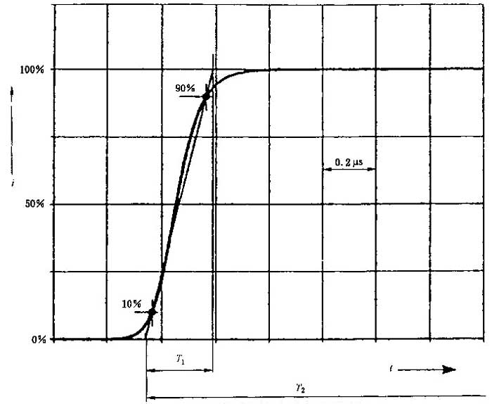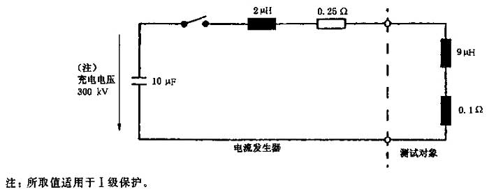規(guī)定了測試參數(shù)并示出了測試發(fā)生器的電路圖,可利用這些參數(shù)及發(fā)生器來模擬與直接雷擊相關的雷電流的快速上升部分。此模擬適用于首次短時雷擊及后續(xù)短時雷擊的模擬。