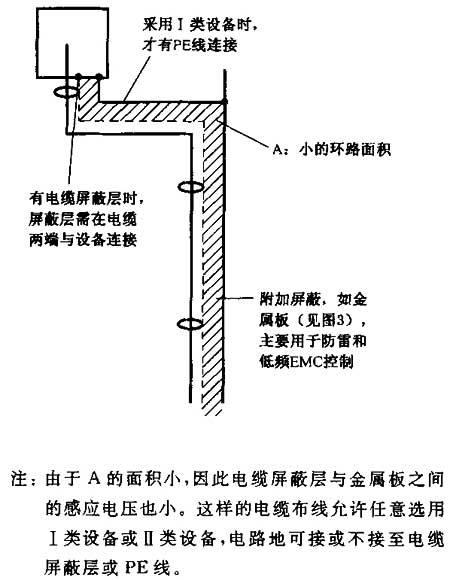 表示電源電纜與信號(hào)電纜緊挨著布線也可以避免形成大的環(huán)路。信號(hào)電纜建議采用屏蔽電纜。屏蔽電纜的屏蔽層應(yīng)在兩端與設(shè)備外殼等電位連接(見圖2)。