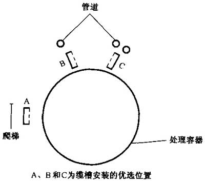 如7.3.2所述,對(duì)于建筑物間的電纜,通過將電纜敷設(shè)于各段搭接的導(dǎo)管、線槽或金屬管中,可防止電纜中產(chǎn)生高的感應(yīng)電壓。引向某特定設(shè)備的所有電纜應(yīng)在同一點(diǎn)引出電纜槽。如果可能,應(yīng)將電纜布設(shè)在建筑物的管型部件中,從而充分利用建筑物本身的固有屏蔽特性。如果不可能,例如處理容器的情況,則電纜緊挨容器布設(shè)在容器的外部,并充分利用管道、環(huán)形鋼爬梯以及其他任何相互搭接良好的金屬材料所提供的自然屏蔽作用(見圖5)。在用角鋼構(gòu)成的桿塔上(見圖6),電纜宜布設(shè)在角鋼的內(nèi)角處,以獲得結(jié)構(gòu)件的最大保護(hù)。所有這些技術(shù)措施,使電纜與結(jié)構(gòu)件構(gòu)成的環(huán)路中感應(yīng)的電壓為最小,從而減少旁側(cè)閃絡(luò)的危險(xiǎn)。旁側(cè)閃絡(luò)是設(shè)備內(nèi)部電路與設(shè)備結(jié)構(gòu)件之間形成的電弧,電弧形成后導(dǎo)致大電流流入饋送電纜。