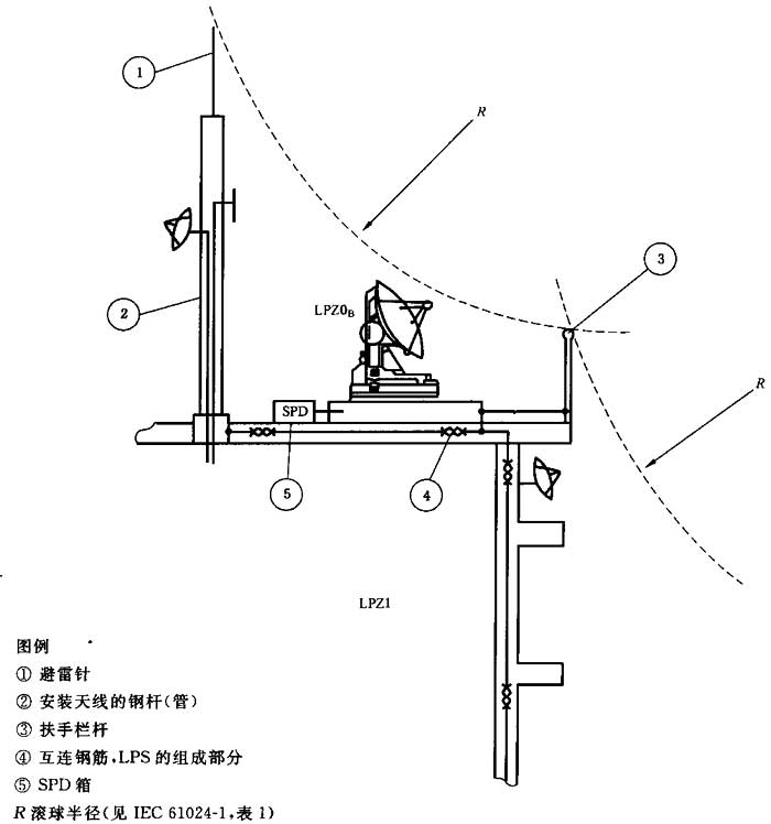 f) 屋頂金屬裝置需防直接雷擊時(shí),宜使之位于LPZ0B區(qū)中。例如,通過安裝一局部接閃器使之位于LPZ0B區(qū)。該接閃器應(yīng)與建筑物的LPS等電位連接(見IEC 61024-1-2:1990中,圖48)。該局部接閃器與金屬裝置間應(yīng)滿足安全距離d的要求(見IEC 61024-1:1990,3.2)。